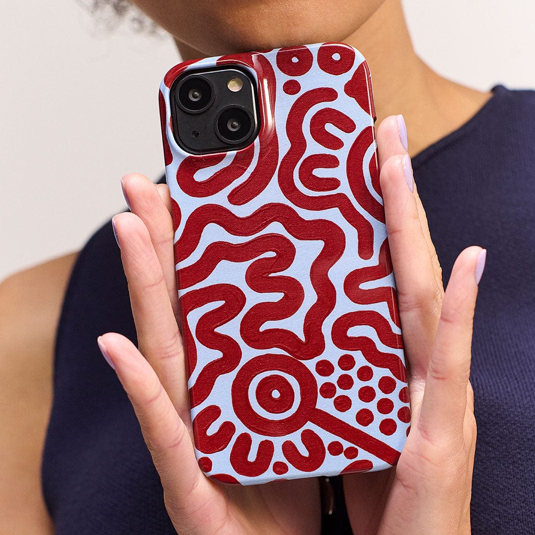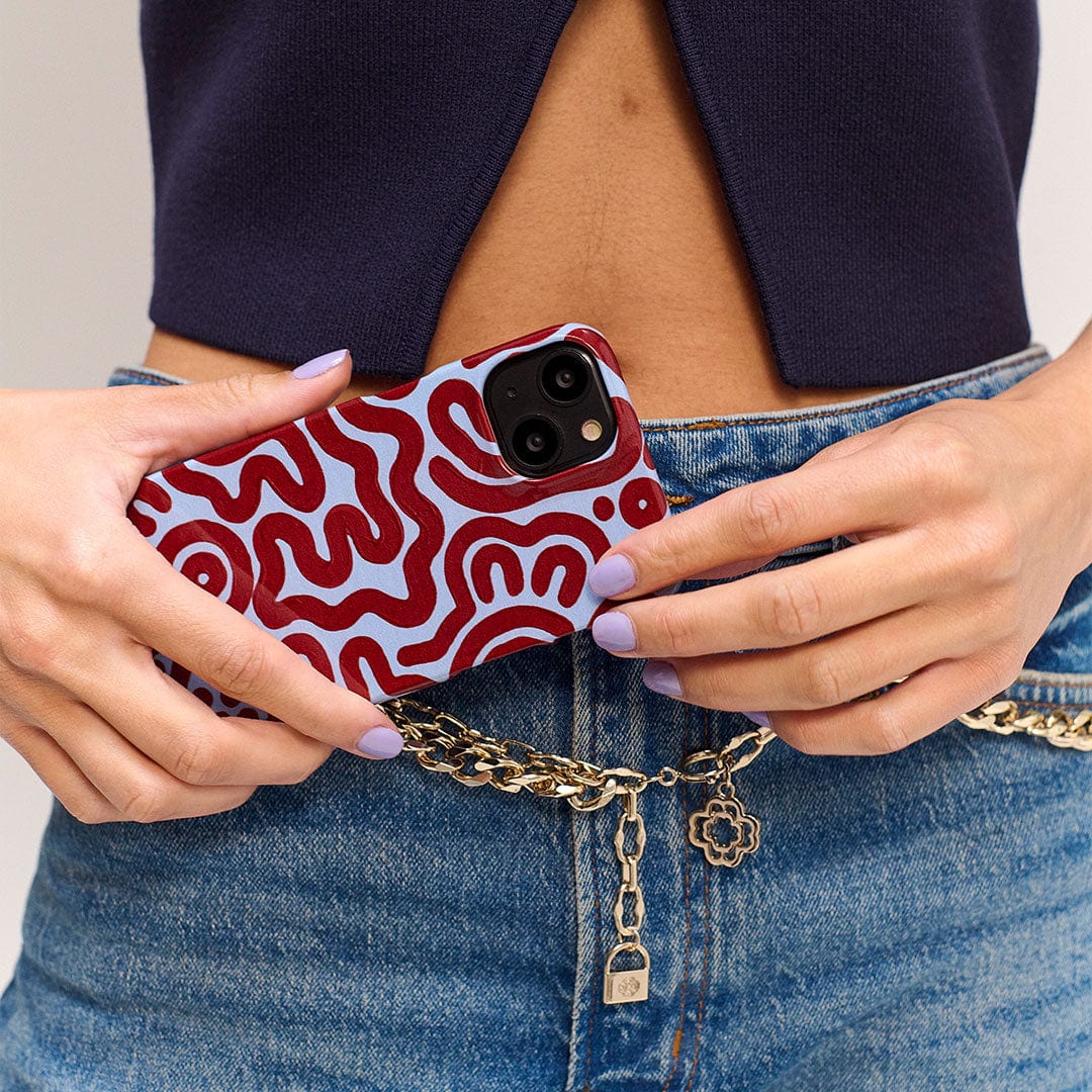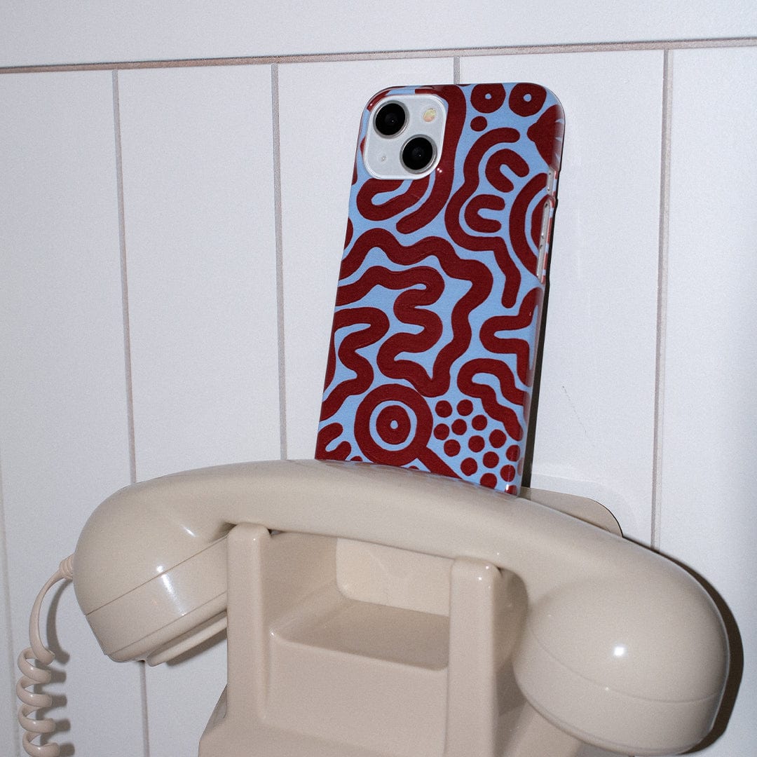 Introducing the Anka phone case by artist Ryhia Dank, featuring a stunning hand-painted blue and burgundy abstract artwork. This case design is meant to evoke a sense of familiarity and comfort amidst the occasional chaos of daily life.