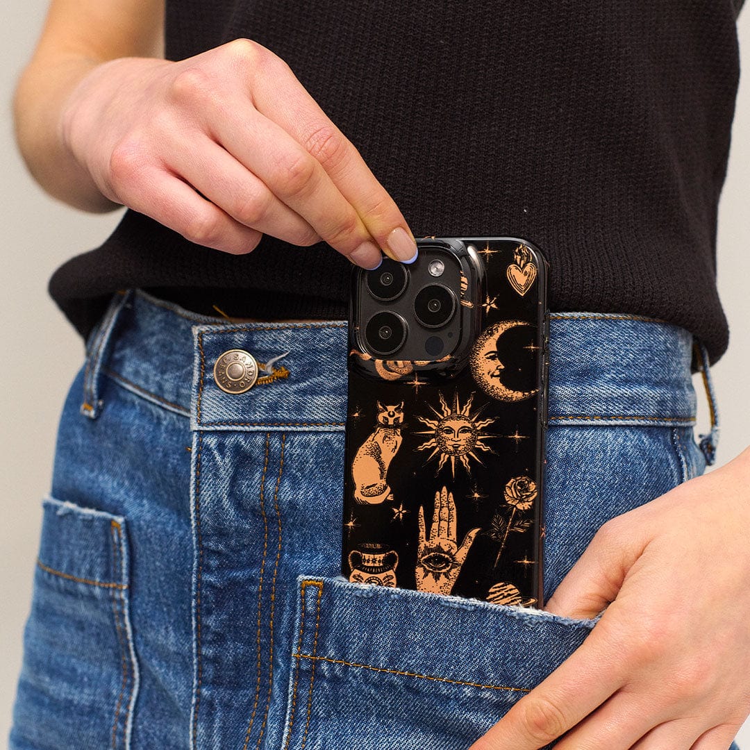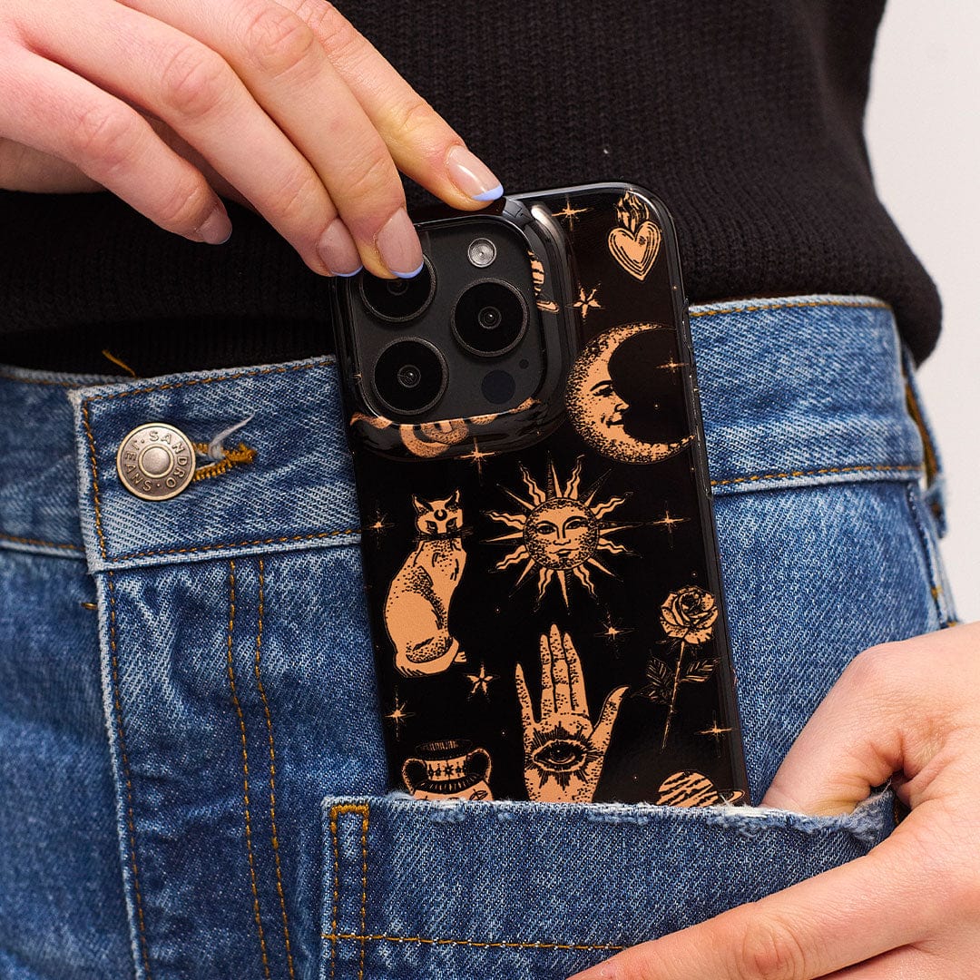 Let your charm shine with the Astro Flash Noir phone case. With a celestial design featuring the sun, moon, flowers, stars, and more, this case not only protects your iPhone, Samsung Galaxy, or Google Pixel, but also adds a touch of enchantment to your unique style.