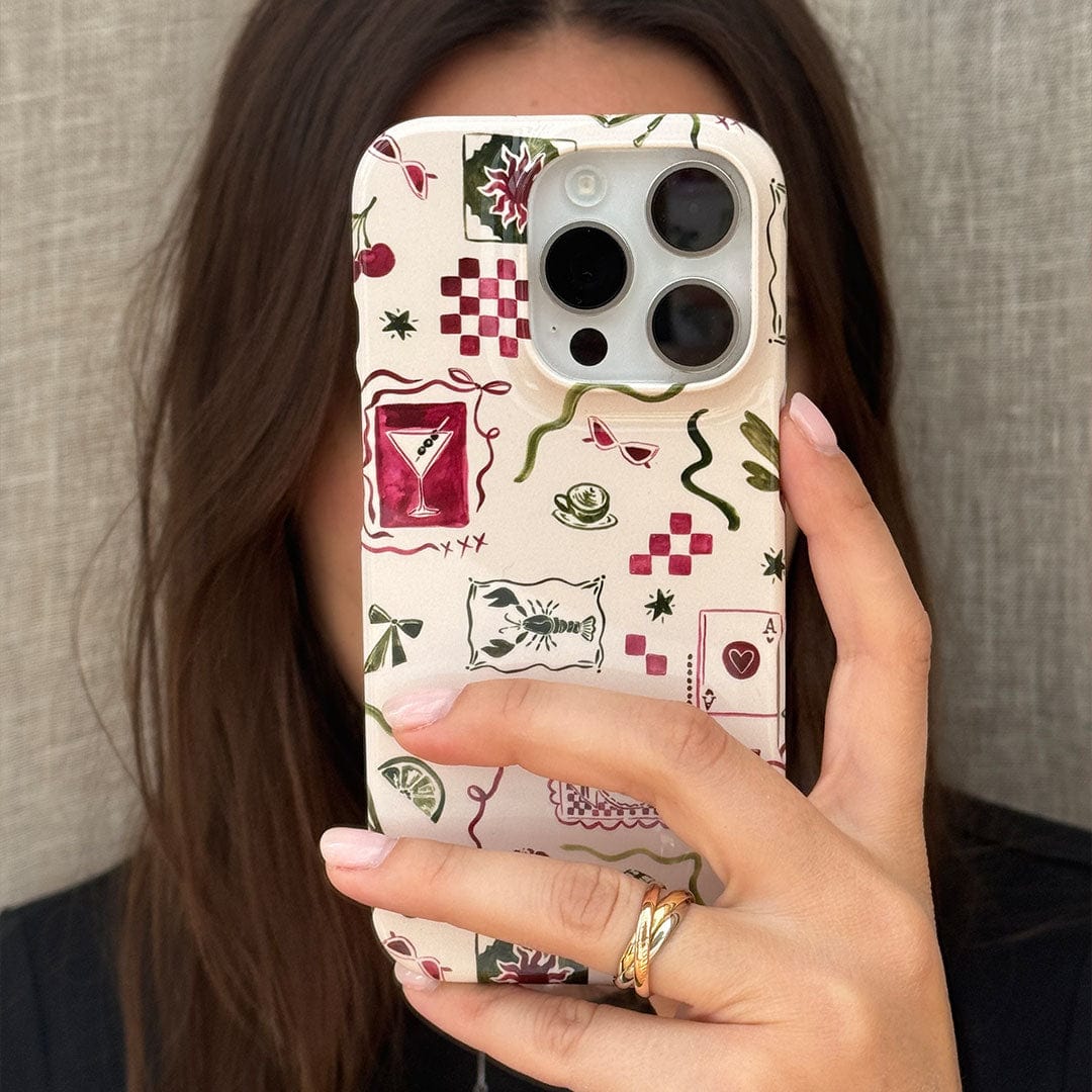 Say cheers to style with our Martini Gal phone case! This playful design features a whimsical mix of martinis, croissants, ribbons, and cards (to name a few), all illustrated in vibrant tones of deep red wine and rich greens against a chic beige backdrop. Perfect for anyone with a taste for the finer (and fun) things in life, this case offers a blend of personality and protection. Made from durable materials, Martini Gal keeps your phone safe while adding a dash of flair. Please note: reds may print darker than they appear on-screen, enhancing the mood of this unique design.