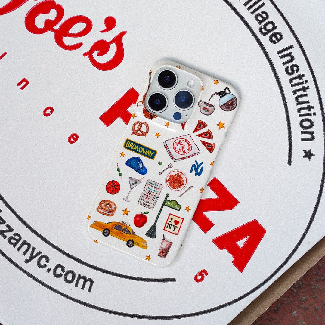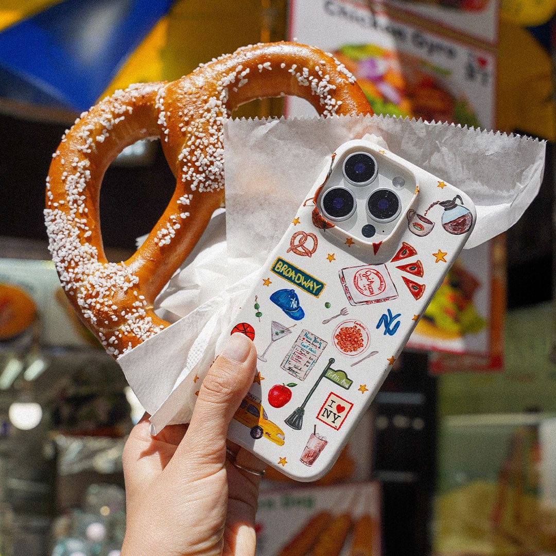 Experience the NYC vibe in a fresh new way with this illustrated phone case by BG Studio. Now set against a light cream background, this design highlights everything we love about the city, pizza, pretzels, a classic cup of joe, and more. Add a touch of Big Apple charm to your phone and showcase your love for NYC in style.