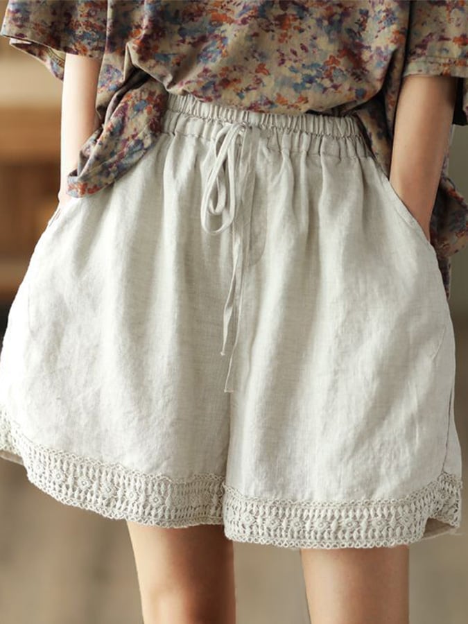 Retro Hollow Crochet Mosaic Cotton Linen Shorts