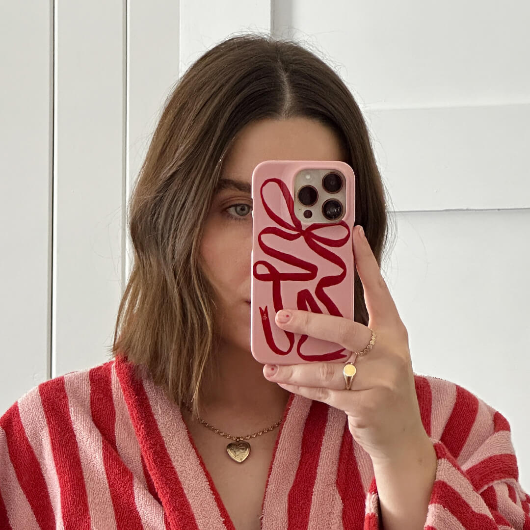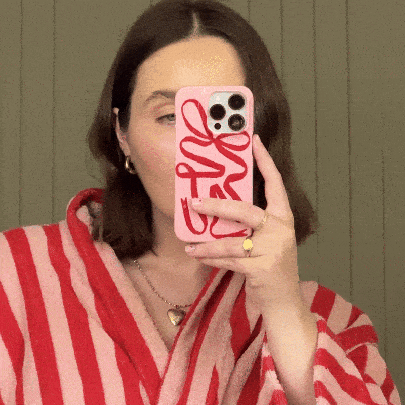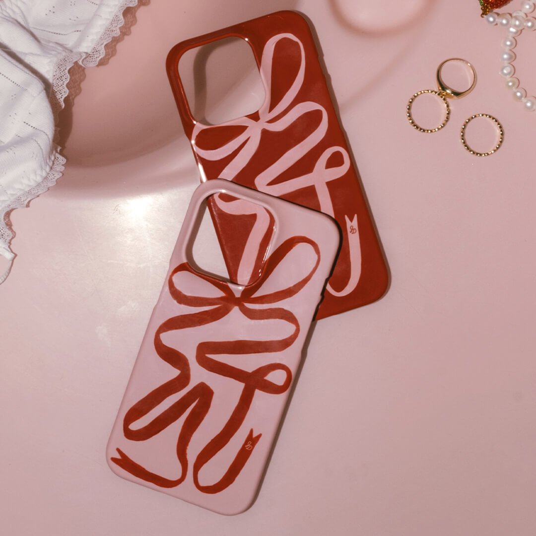 Experience the ultimate accessory with the Jasmine Dowling x The Dairy Valentine Ribbon phone case. The vibrant pink background and striking red bow pattern combine to create a cute and protective design.