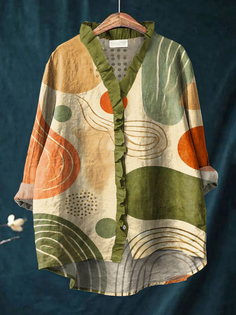 Women's Abstract Color Block Art Print Casual Cotton And Linen Ruffle Shirt