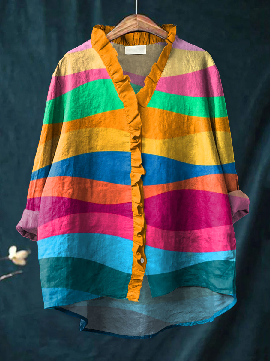Women's Bright Abstract Ripple Art Print Casual Cotton And Linen Ruffle Shirt
