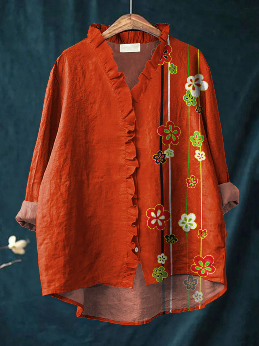 Women's Colorful Flower Art Print Casual Cotton And Linen Ruffle Shirt