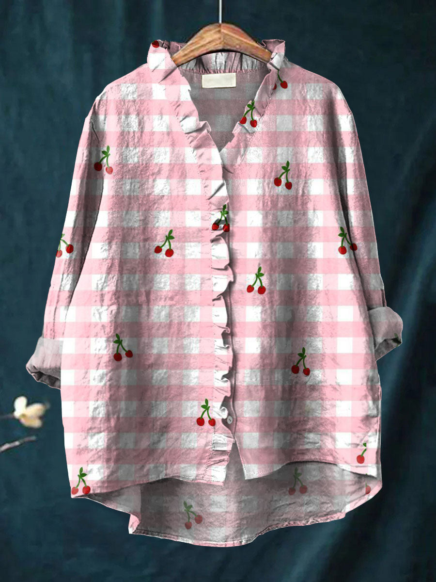 Women's Lovely Cherry Plaid Pattern Art Print Casual Cotton And Linen Ruffle Shirt