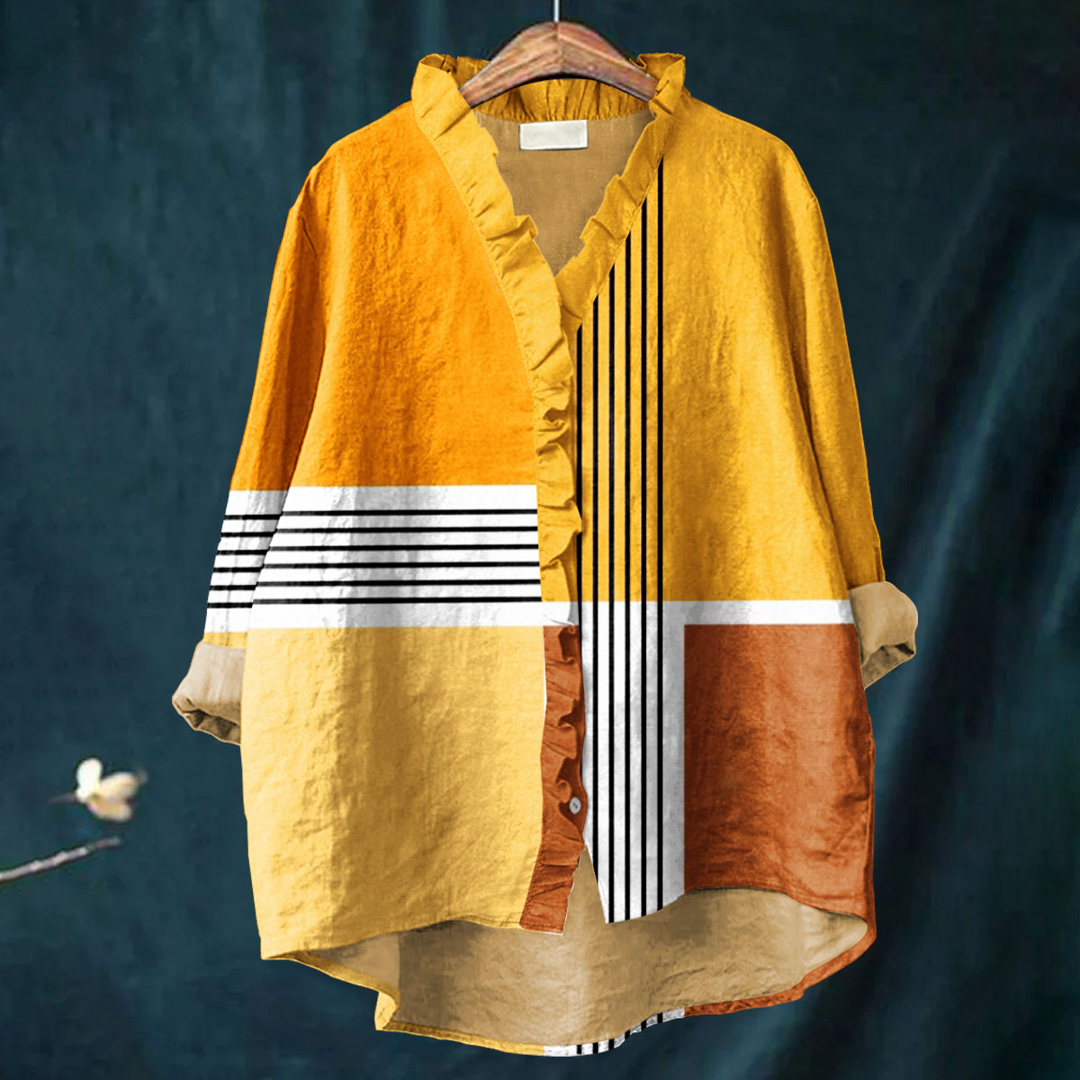 Women's Vintage Abstract Geometric Lines Art Print Casual Cotton And Linen Ruffle Shirt