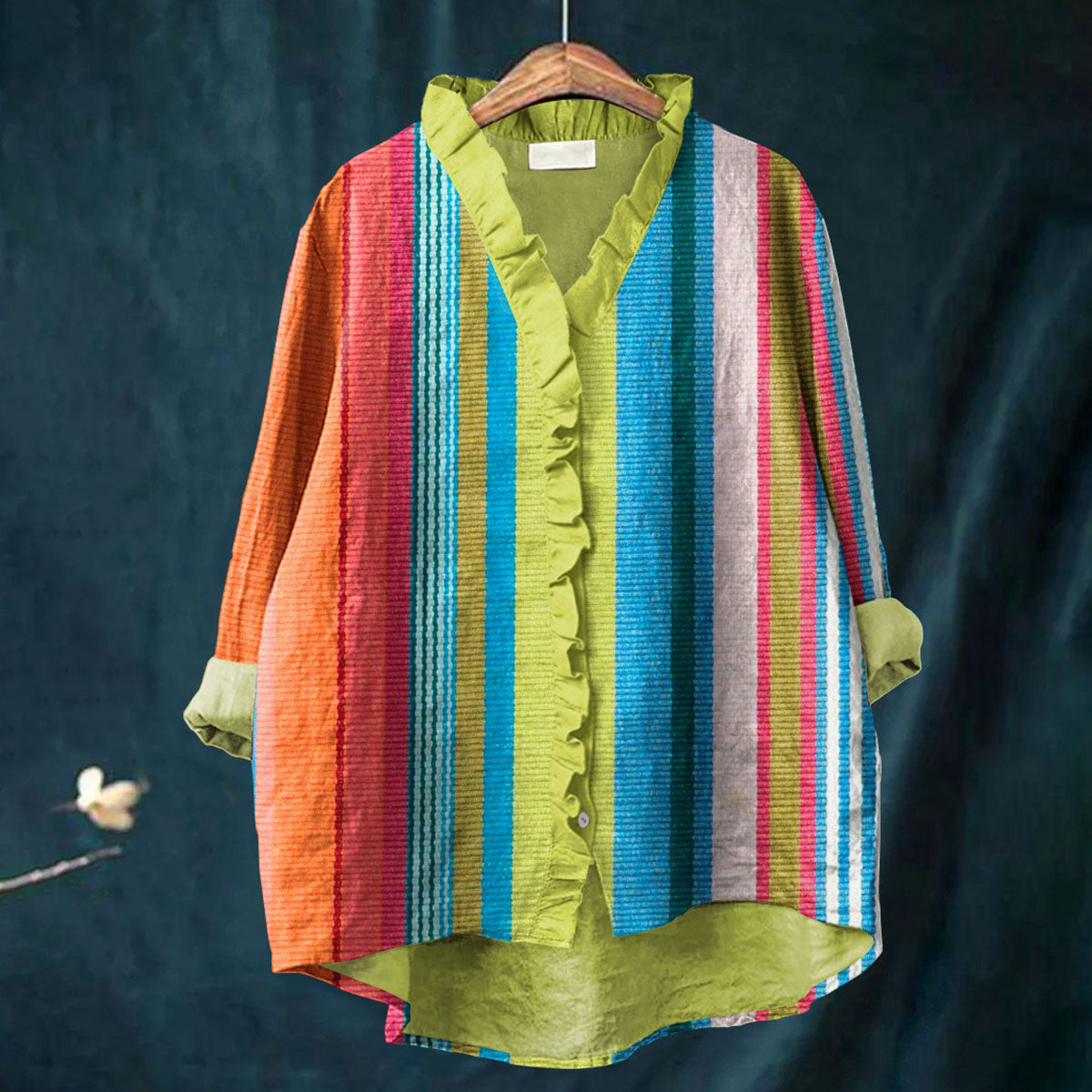 Women's Vintage Abstract Geometric Lines Art Print Casual Cotton And Linen Ruffle Shirt